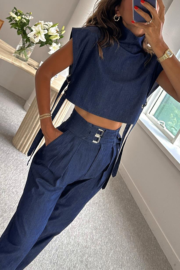 Posie High Neck Side Straps Top and Cargo Belt Pocketed Pants Set