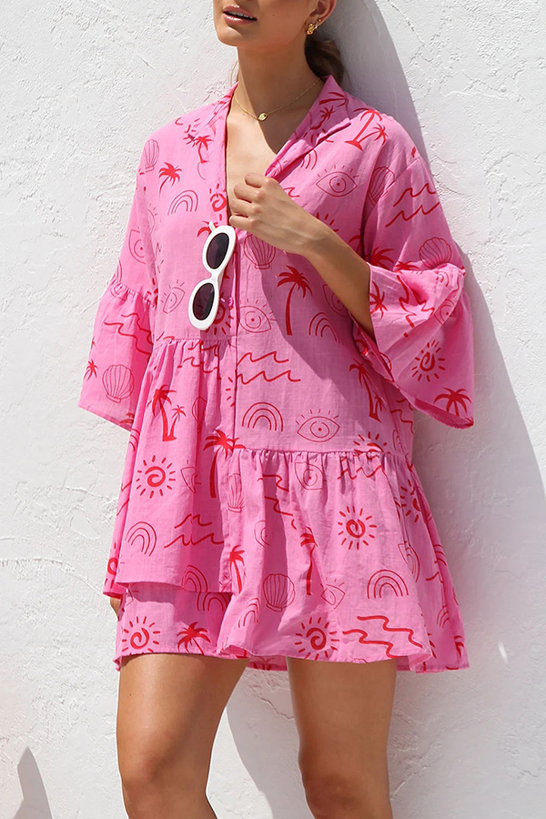 Shelby Unique Print Bell Sleeve Smock Style Tiered Shirt Mini Dress