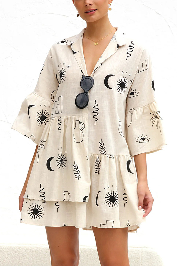 Shelby Unique Print Bell Sleeve Smock Style Tiered Shirt Mini Dress
