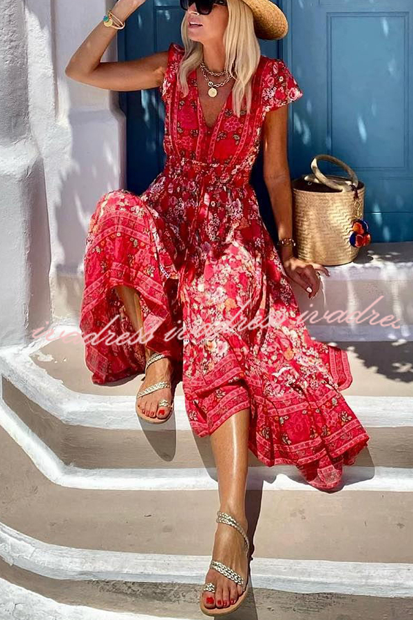 Summer in Greece Boho Print Ruffle Sleeve Elastic Waist High-low Midi Dress