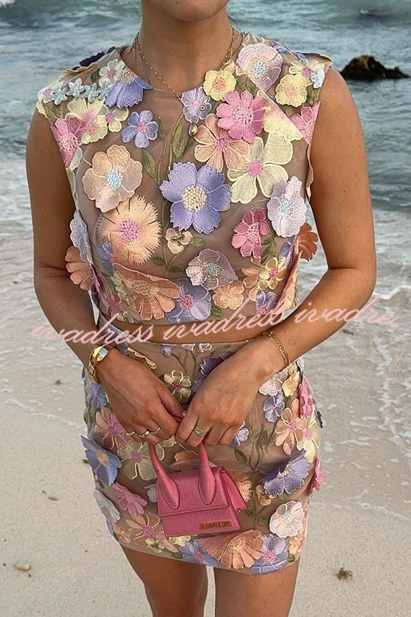 Sunday Charm Embroidered Floral Applique Crop Top and High Rise Mini Skirt Set
